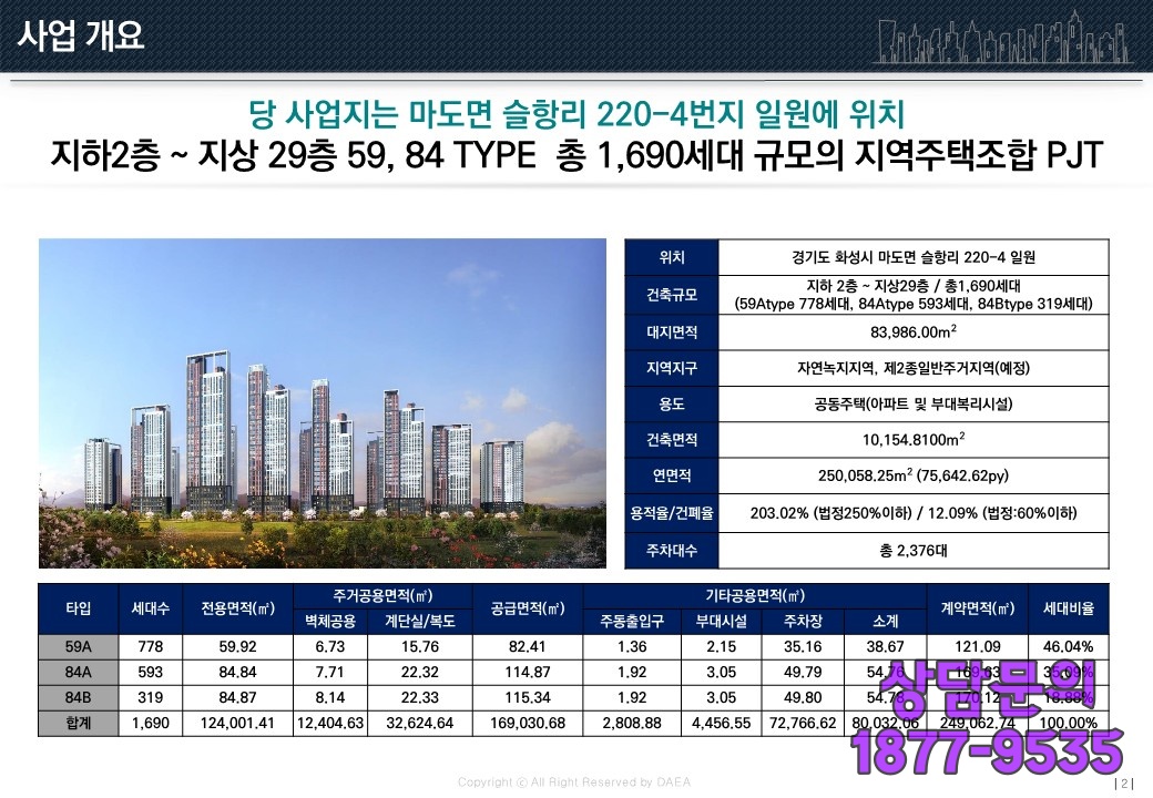 전용면적(專用面積) 59와 84 두가지타입으로 총(總) 1690세대(世帶)가 공급(供給)될 예정(豫定)이죠.