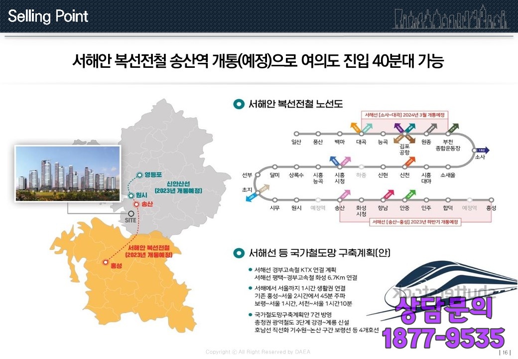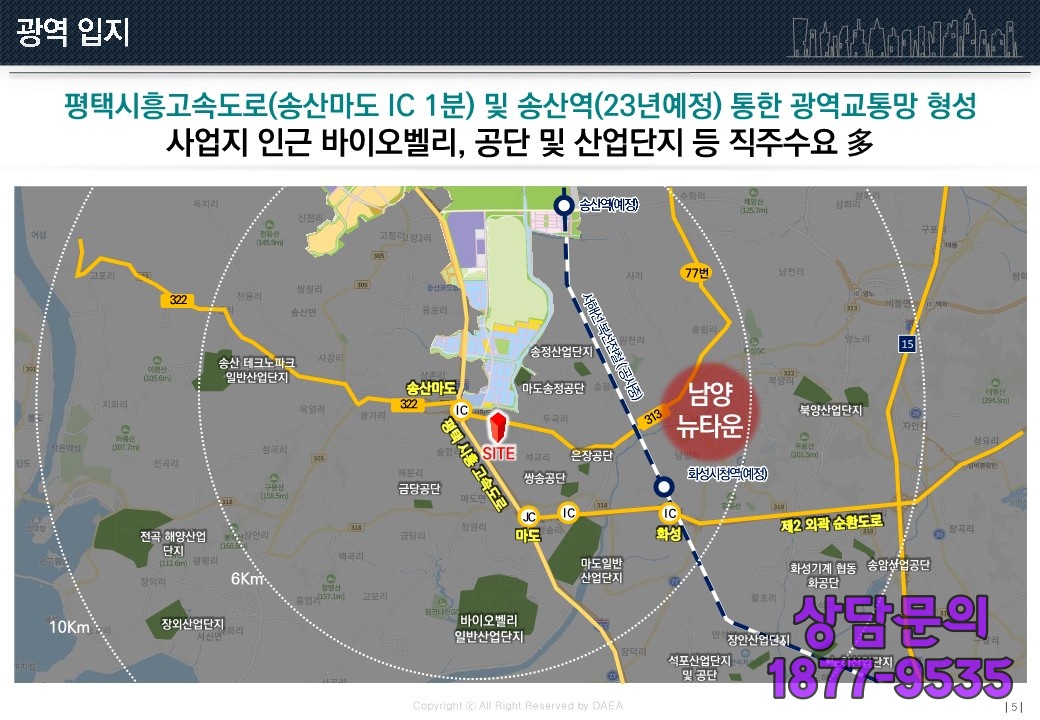 인근(隣近)에 평택시흥고속도로(平澤始興高速道路)와 송산역개통예정(山役開通豫定)에 있다보니 광역교통망(廣域交通網)을 형성(形成)한다고 볼 수 있으며, 바이오밸리와 공단(工團) 그리고 산단(産團)까지 직주근접(直走近接)을 원(願)하는 수요(需要)를 흡수(吸收)할 수 있는 입지(立地)를 자랑하는 화성 슬항리 서희스타힐스 6차 입니다.